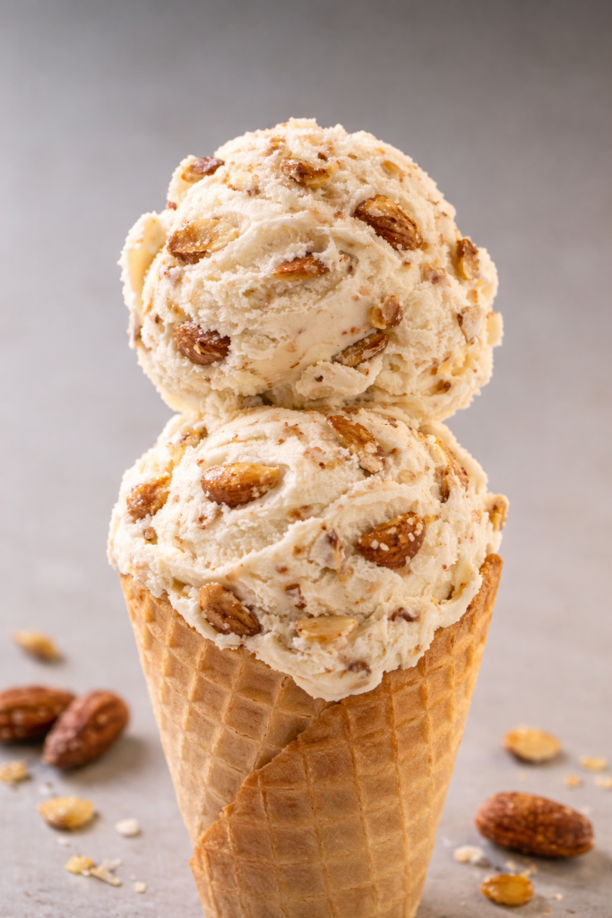 Roughly chop the honey-roasted almonds. You can toast them lightly in a dry pan for extra flavor, but it’s optional. - Churn the ice cream: