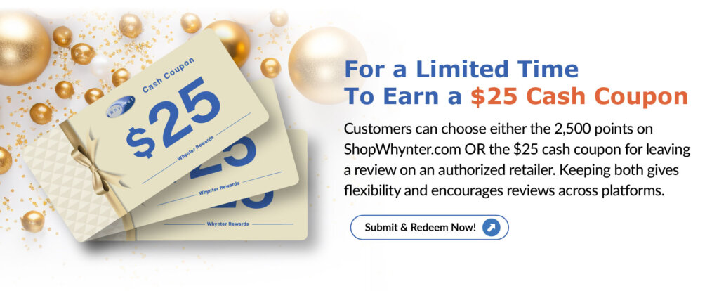 Choose either 2,500 points for posting a verified review on ShopWhynter.com OR a $25 Cash Coupon for leaving a verified review on your favorite Whynter authorized retailer’s website (such as Amazon, Home Depot, etc.).